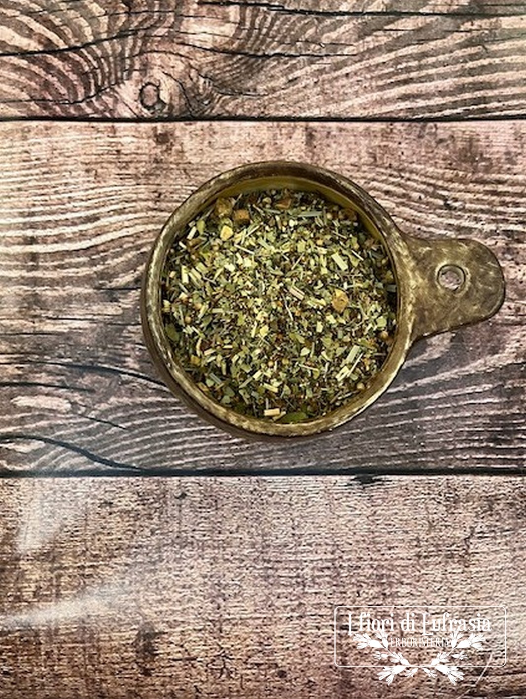 Matè verde, rooibos, foglie di lemongrass, pezzi di mela, semi di finocchio, semi di coriandolo, radici di liquirizia, foglie di verbena, rizomi di zenzero, foglie di menta piperita, semi di cardamomo, aroma naturale di limone.