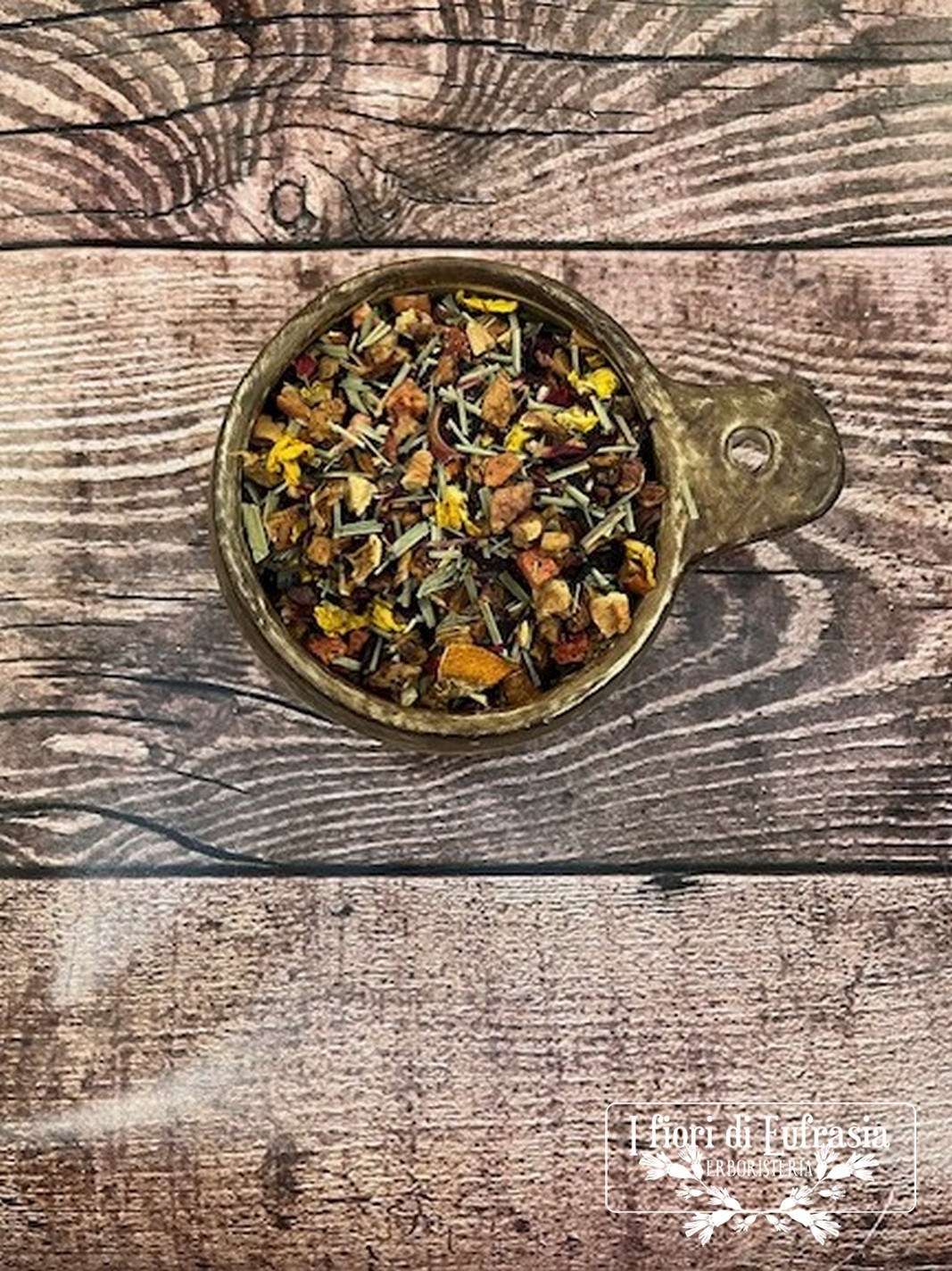 Pezzi di mela, fiori di ibisco, foglie di lemongrass, scorze di agrumi, pezzi di fragola, aromi, fiori di verbasco, aroma naturale di limone. Ottimo anche freddo. Taglio grosso.