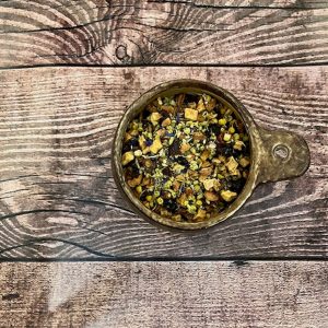 Pezzi di papaya, pezzi di mango, pezzi di mela, fiori di ibisco, aromi, scorze di arancia, arilli di melagrana, fiori di cartamo.